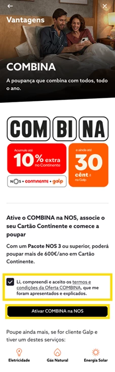 - Confirme que leu e aceita os termos e condições da parceria e selecione “Ativar COMBINA na NOS”;