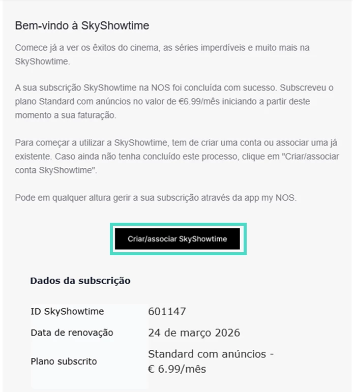 - Aceda à sua caixa de e-mails e selecione “Criar/associar SkyShowtime” no link de confirmação que recebeu;