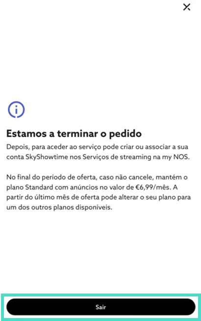 - Recebe a confirmação da subscrição da SkyShowtime ativa com sucesso. Selecione “Sair”;
