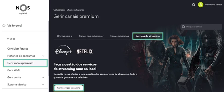 - Aceda a my.nos.pt e, em “Gerir canais premium”, selecione “Serviços de streaming”. Escolha “Gerir serviços streaming”;