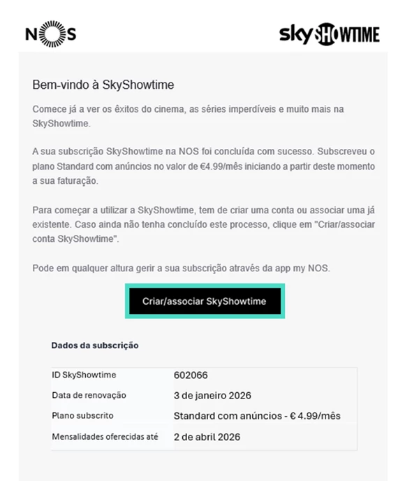 - Aceda à sua caixa de e-mails e selecione “Criar/associar SkyShowtime” no link de confirmação que recebeu;