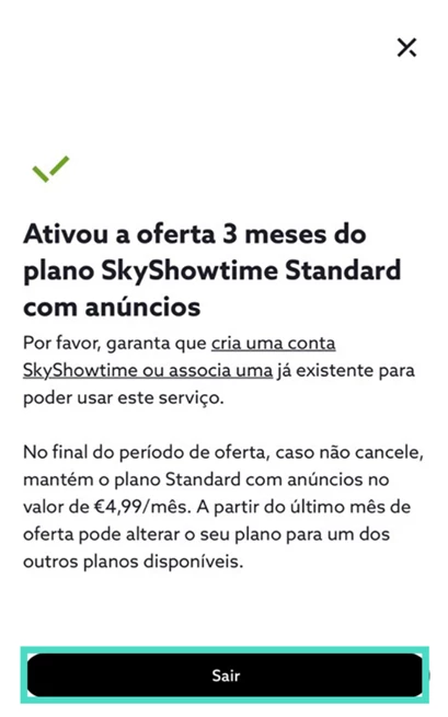 - Recebe a confirmação da subscrição da SkyShowtime ativa com sucesso. Selecione “Sair”;
