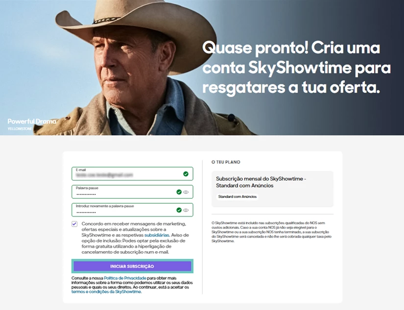 - Em seguida, defina a Password de acesso à sua conta SkyShowtime e, para concluir, selecione “Iniciar Subscrição”;
