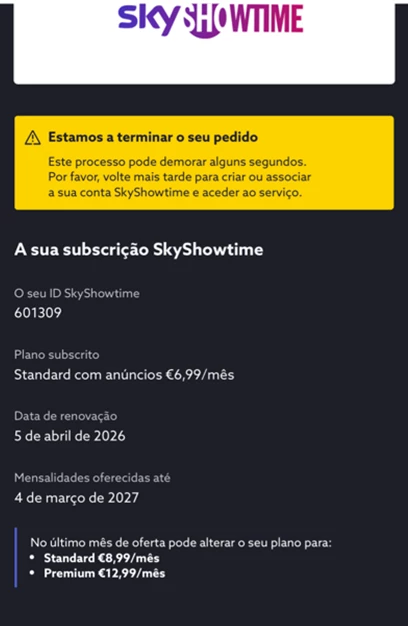 Por fim, recebe a confirmação de que o plano da SkyShowtime foi alterado com sucesso.