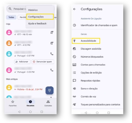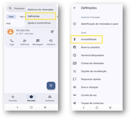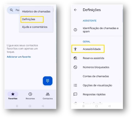 - Na área de telefone, em “Mais opções” selecione “Definições” e escolha “Acessibilidade”.