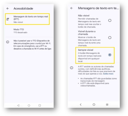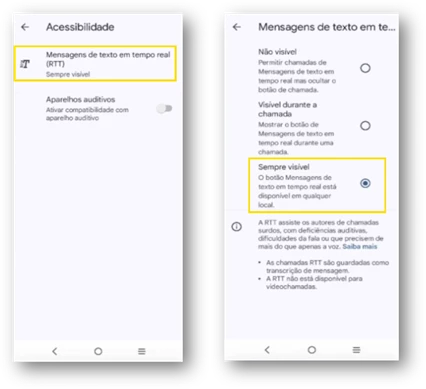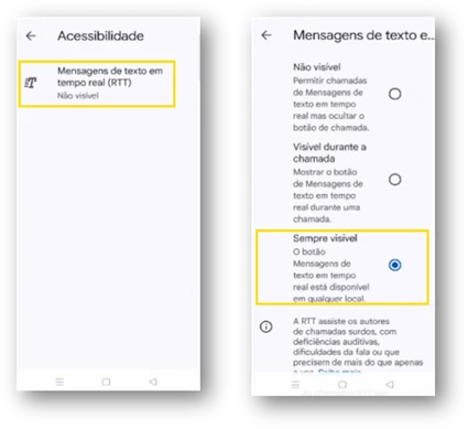 - Selecione “Mensagens de texto em Tempo Real (RTT)” e escolha “Sempre visível”.