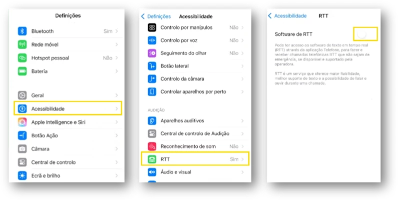- Para ativar o RTT num equipamento Apple aceda às definições do seu dispositivo e siga os passos abaixo: