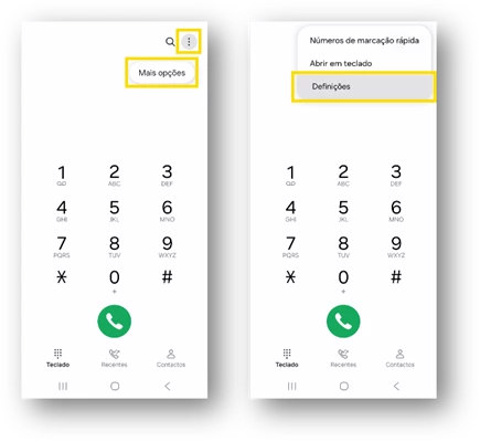 - Na área de telefone selecione o menu “Mais opções” e escolha “Definições;