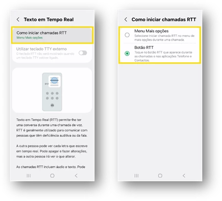 - Selecione “Como iniciar chamadas RTT” e escolha de que forma pretende iniciar chamadas RTT, através do “Menu Mais Opções” ou através do “Botão RTT”.