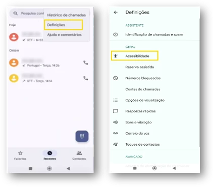 - Na área de telefone em “Mais opções” selecione “Definições” e escolha “Acessibilidade”.