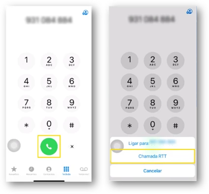 - Após inserir o número para o qual pretende ligar, selecione o botão de chamada e escolha a opção “Chamada RTT”.