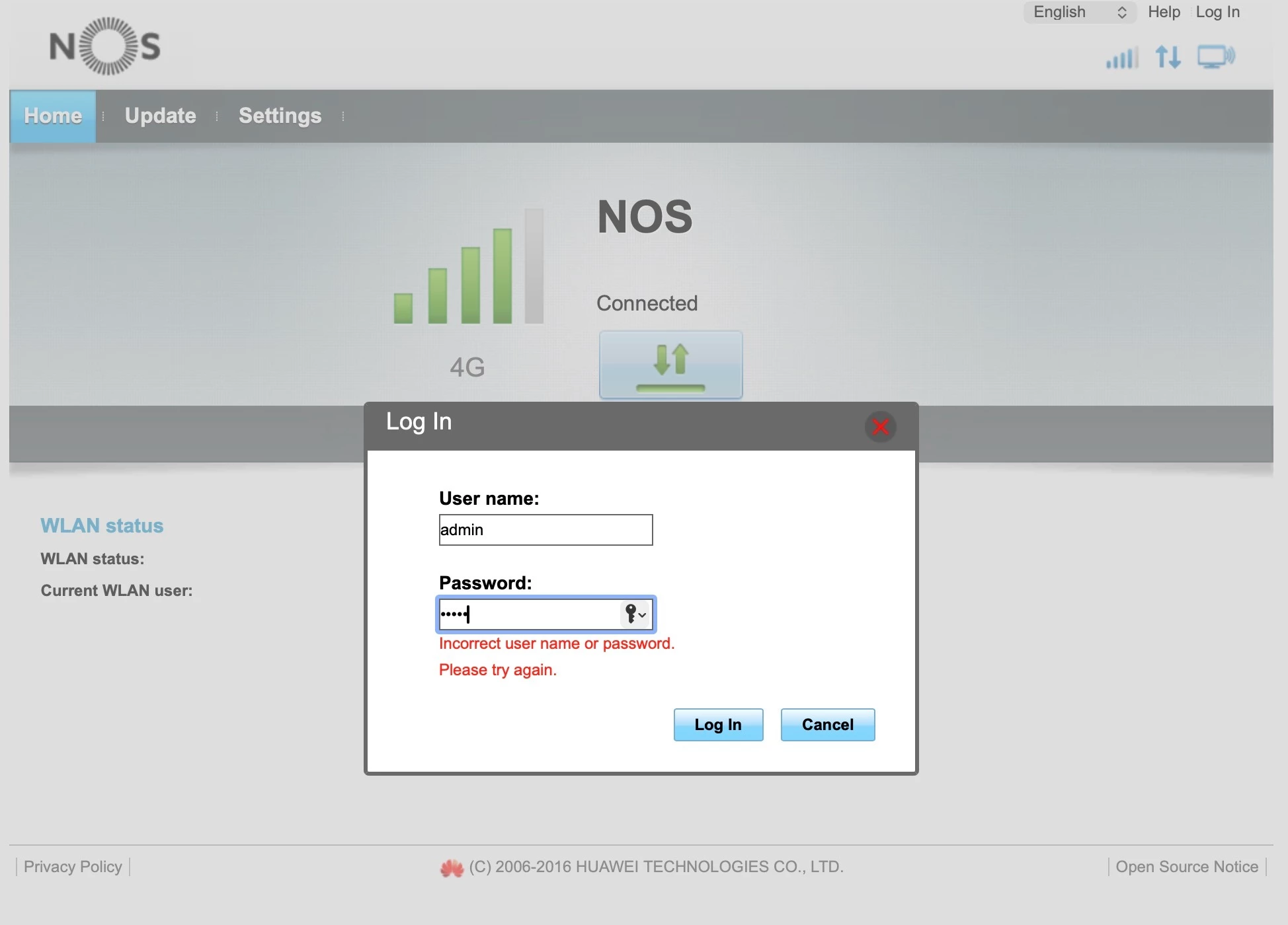 Portuguese: Quero ligar o modem Huawei B310s a uma rede mesh TP-Link Deco E4 através de um cabo Ethernet. Disseram-me que o Wi-Fi do Huawei deve ser desligado, mas não consigo aceder à página web de gestão do Huawei porque não aceita «admin» como nome de utilizador e palavra-passe.