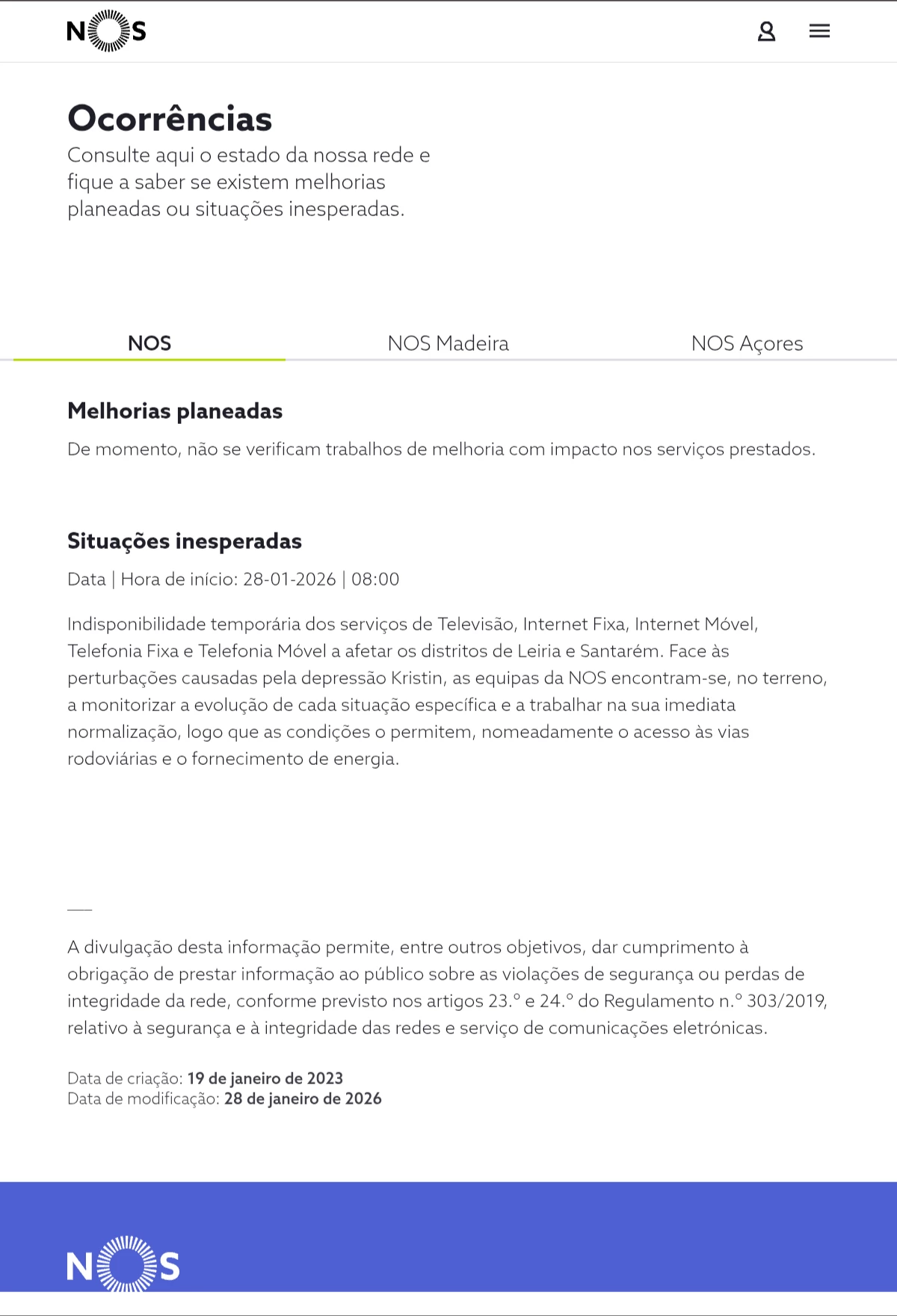 As nossas equipas técnicas continuam mobilizadas no terreno para repor, com a maior brevidade possível, os serviços fixos e móveis afetados pela Depressão Kristin. Já foi possível reativar a rede móvel em todas as sedes de concelhos, ainda que em algumas zonas de forma parcial e sujeita a instabilidade. Nos concelhos afetados, atribuímos aos clientes móveis dados ilimitados durante 30 dias. A NOS, de acordo com a legislação em vigor, vai creditar os dias sem serviço automaticamente na fatura seguinte no final do período de indisponibilidade, sem ser necessário qualquer ação da sua parte.