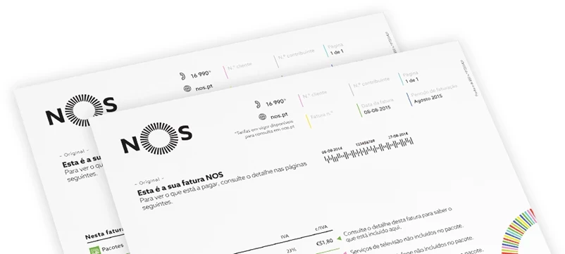 A fatura NOS está organizada de acordo com os produtos e serviços contratados e pode ser consultada em diversos meios, como a my NOS, a área de cliente, a fatura eletrónica por SMS ou e-mail e em papel.