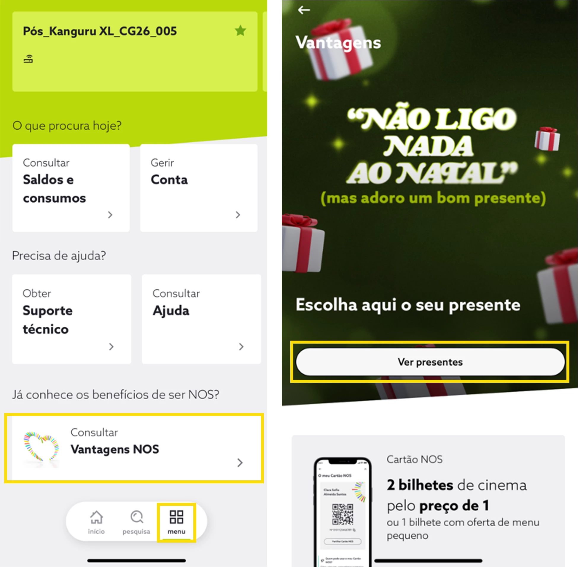 - Em “Menu” escolha “Consultar Vantagens NOS” e de seguida, selecione “Ver presentes”;