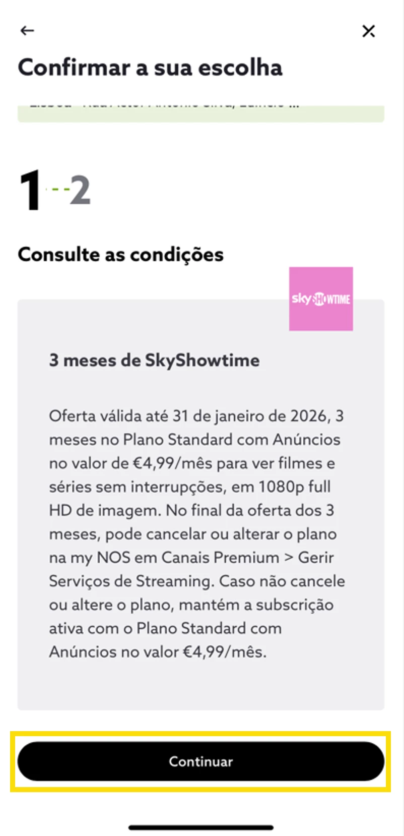 - Consulte as condições e todas as informações detalhadas sobre a oferta, e selecione “Continuar”;