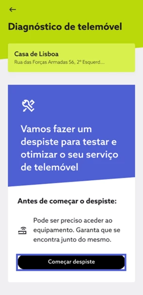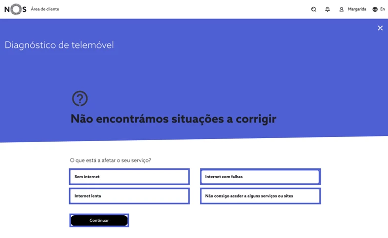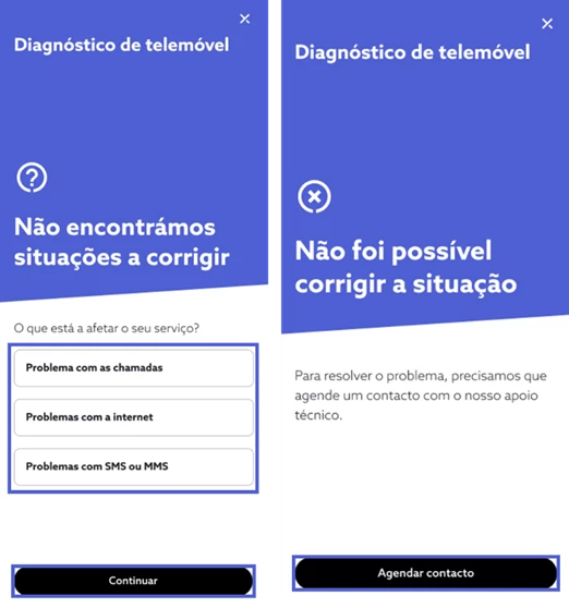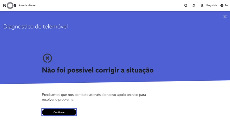 Terminado o processo de resolução, experimente novamente o acesso ao serviço de telemóvel e responda consoante a sua experiência. Se a situação persistir e a funcionalidade de diagnóstico não tenha identificado automaticamente problemas na sua ligação pode, também, reportar manualmente a situação. De seguida, indique o comportamento que pretende reportar, selecione “Continuar” e siga os passos de despiste. Se a funcionalidade de diagnóstico não resolva remotamente o problema, o seu caso é direcionado de forma prioritária para a nossa equipa de apoio técnico e obter assistência personalizada.