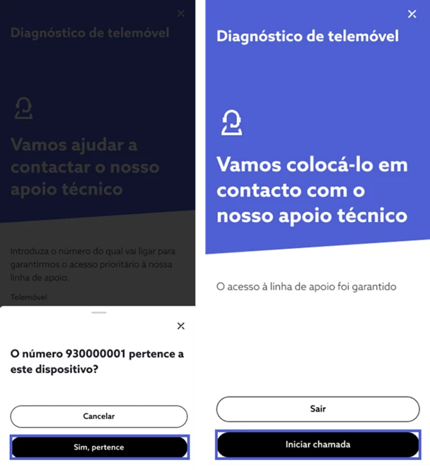 Confirme o número que pretende utilizar para contactar e selecione “Sim, pertence”. Por fim, escolha“Iniciar chamada” para dar início ao contacto com o apoio técnico. ❗A chamada é gratuita desde que realizada de um número NOS. A chamada de outros operadores tem o custo associado. ❗