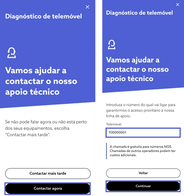 Selecione “Contactar agora” e insira o seu número de telemóvel. De seguida, escolha “Continuar”; Caso não esteja disponível, selecione “Contactar mais tarde”.
