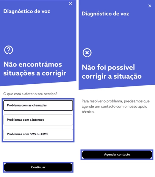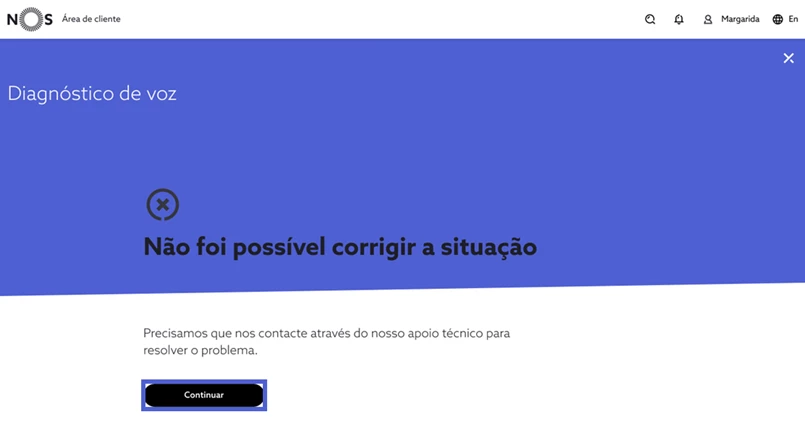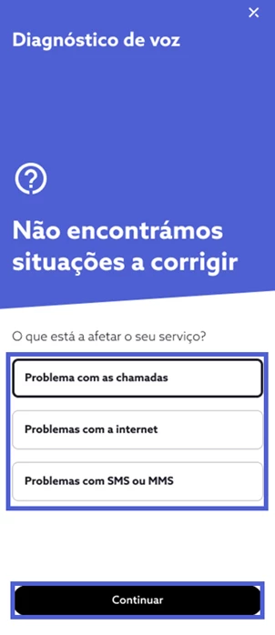 Terminado o processo de resolução, experimente novamente o acesso ao serviço de voz móvel e responda consoante a sua experiência. Se a situação persistir e a funcionalidade de diagnóstico não tenha identificado automaticamente problemas na sua ligação pode, também, reportar manualmente a situação. De seguida, indique o comportamento que pretende reportar, selecione “Continuar” e siga os passos de despiste. Se a funcionalidade de diagnóstico não resolva remotamente o problema, o seu caso é direcionado de forma prioritária para a nossa equipa de apoio técnico e obter assistência personalizada.