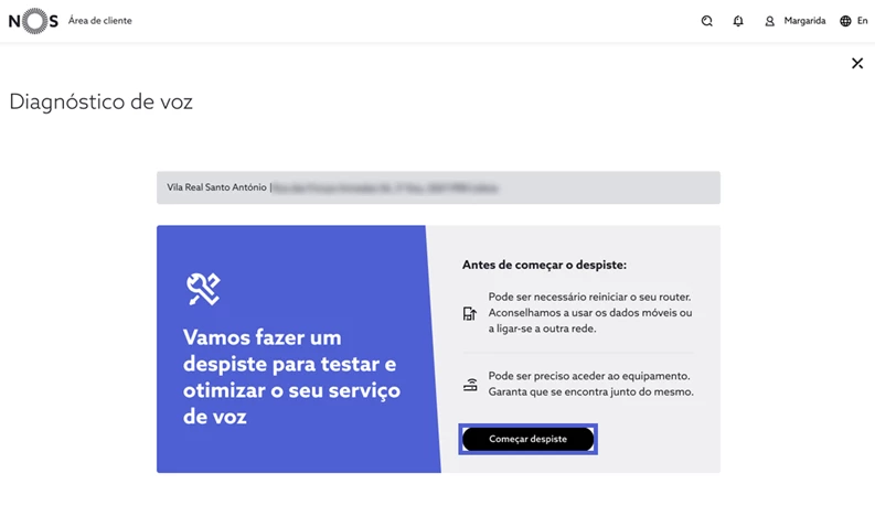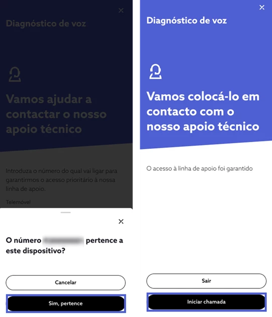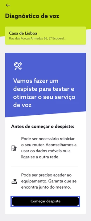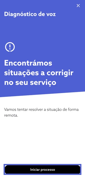 Para iniciar o processo de ajuda, selecione “Começar despiste”; Aguarde, por favor, enquanto a funcionalidade procede ao diagnóstico e verifica o estado do seu serviço de voz móvel;