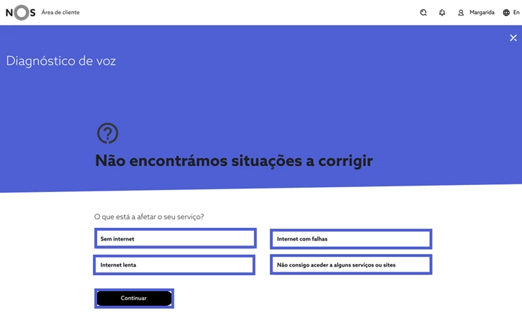 Se a funcionalidade não identificar nenhum problema, pode escolher manualmente a sua situação e seguir com o despiste indicado selecionando “Continuar”;