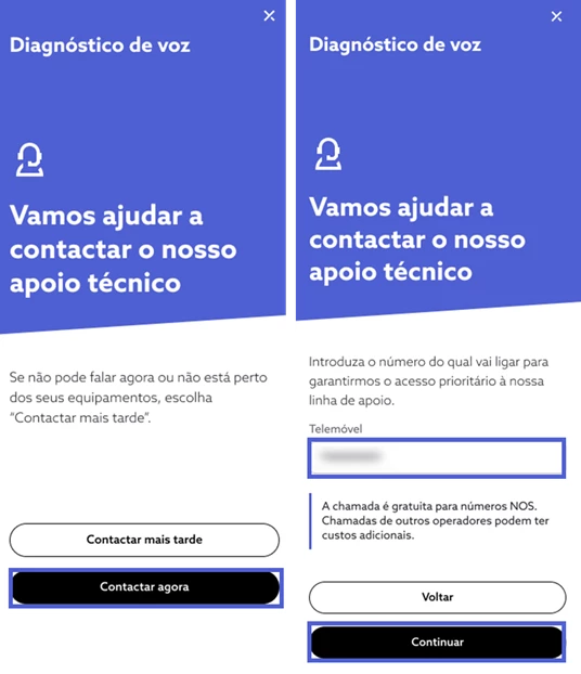 Selecione “Contactar agora” e insira o seu número de telemóvel. De seguida, escolha “Continuar”; Caso não esteja disponível, selecione “Contactar mais tarde”.