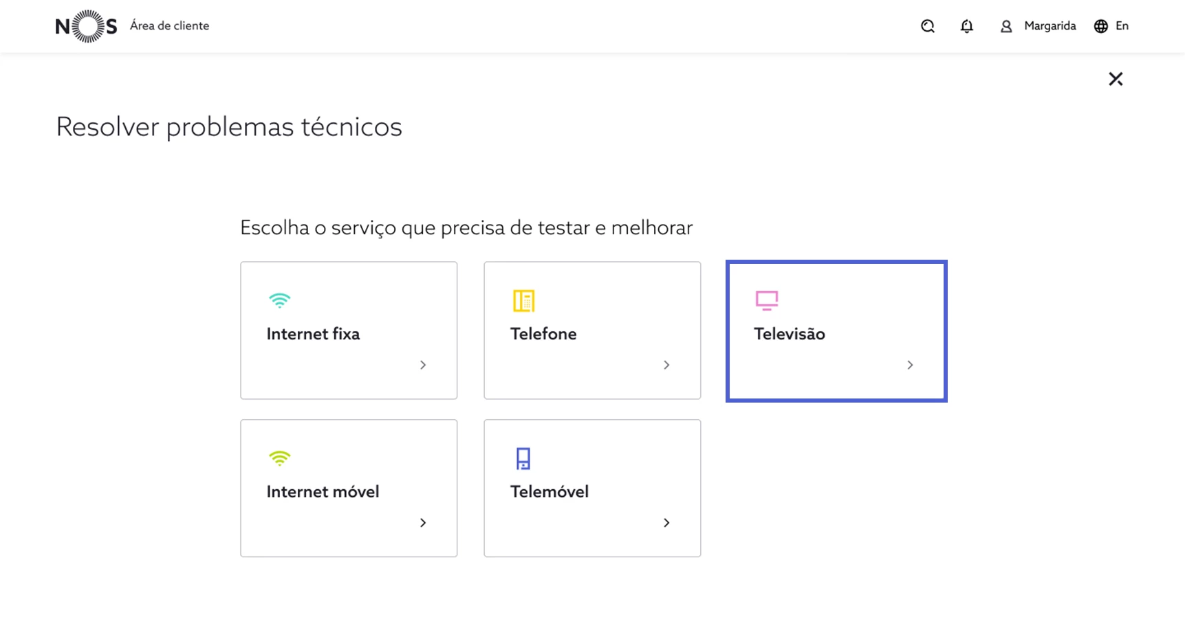 1. Aceda a my.nos.pt, de seguida, em “Suporte técnico”, selecione “Resolver problemas técnicos”;