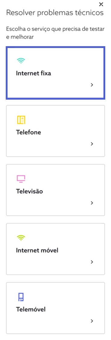 Tem um problema técnico? Use a funcionalidade que assegura um processo de diagnóstico inteligente do seu serviço de internet fixa, identificando as ações de correção mais rápidas e eficazes para o seu caso. 🤖📲