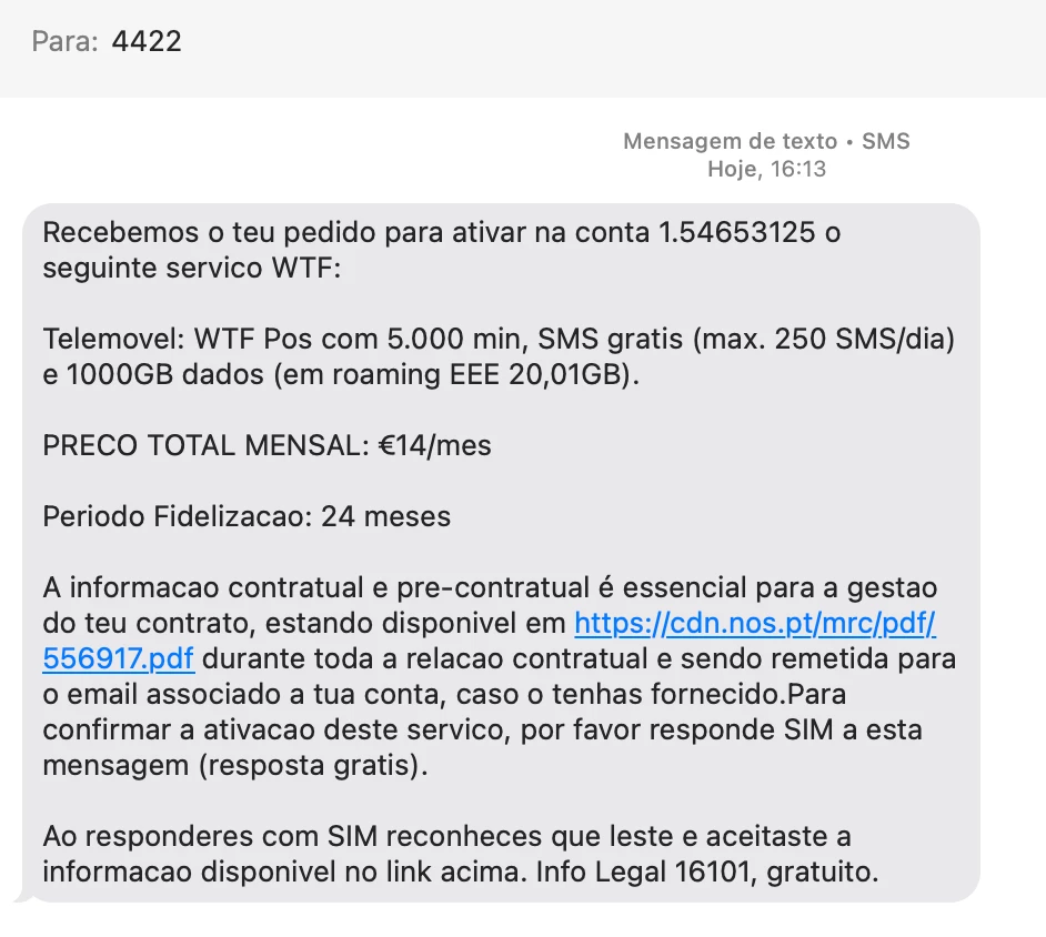 Sou cliente recente. Tenho vários telemóveis no pacote de serviços, um dos quais um WTF. Recebi mensagem da NOS com o seguinte conteúdo: