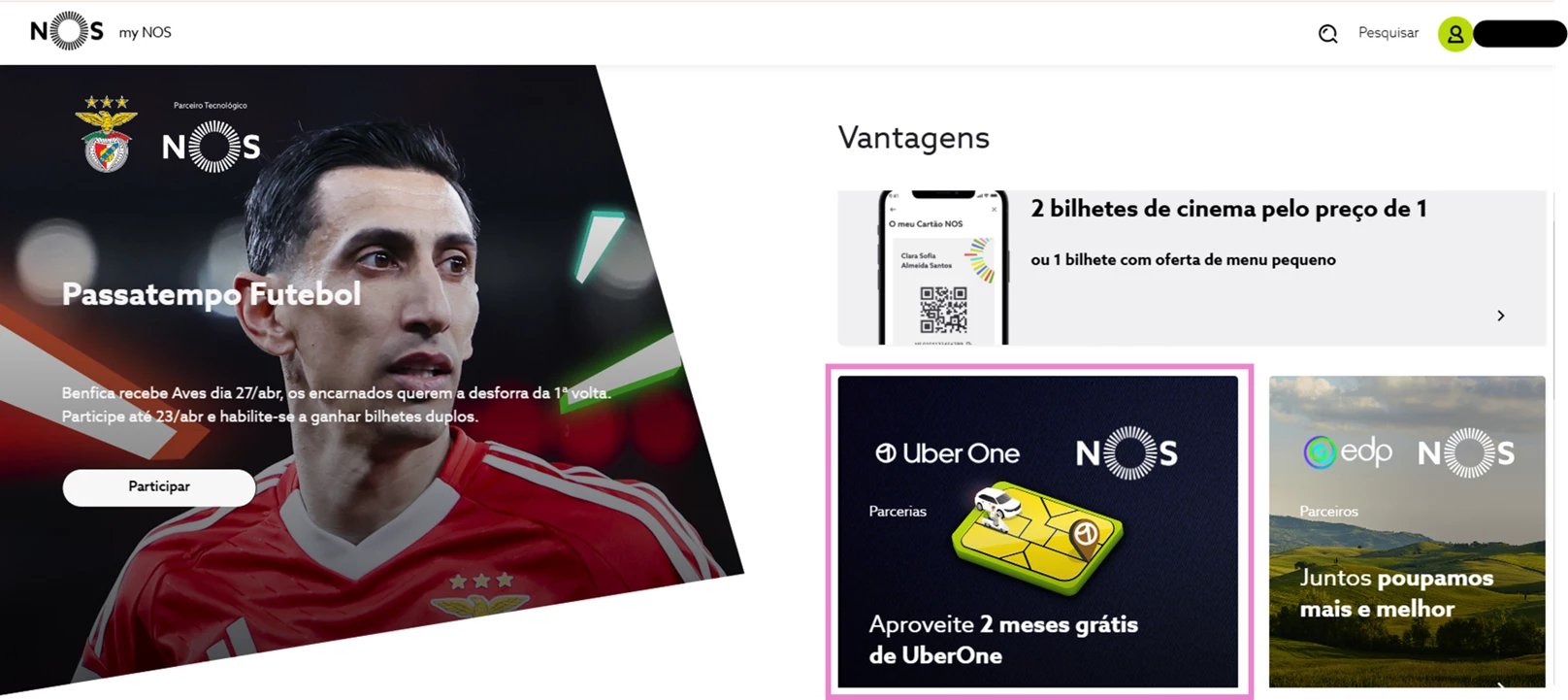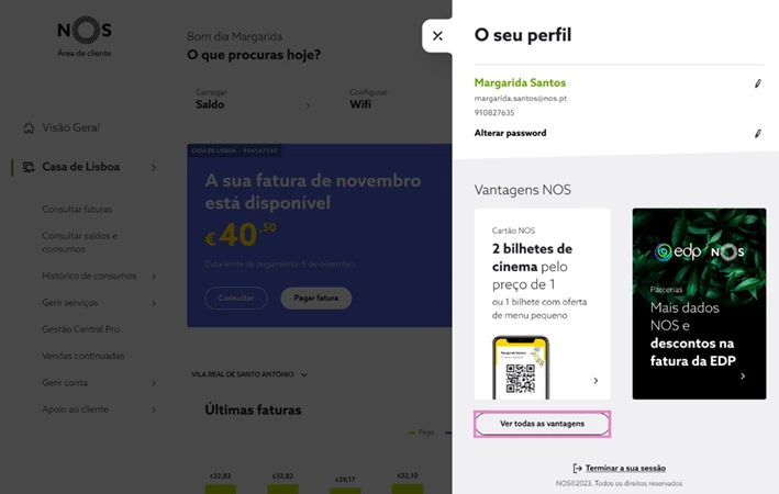 Aceda à app myNOS ou a my.nos.pt, e, em “Menu”, selecione “Vantagens NOS”;