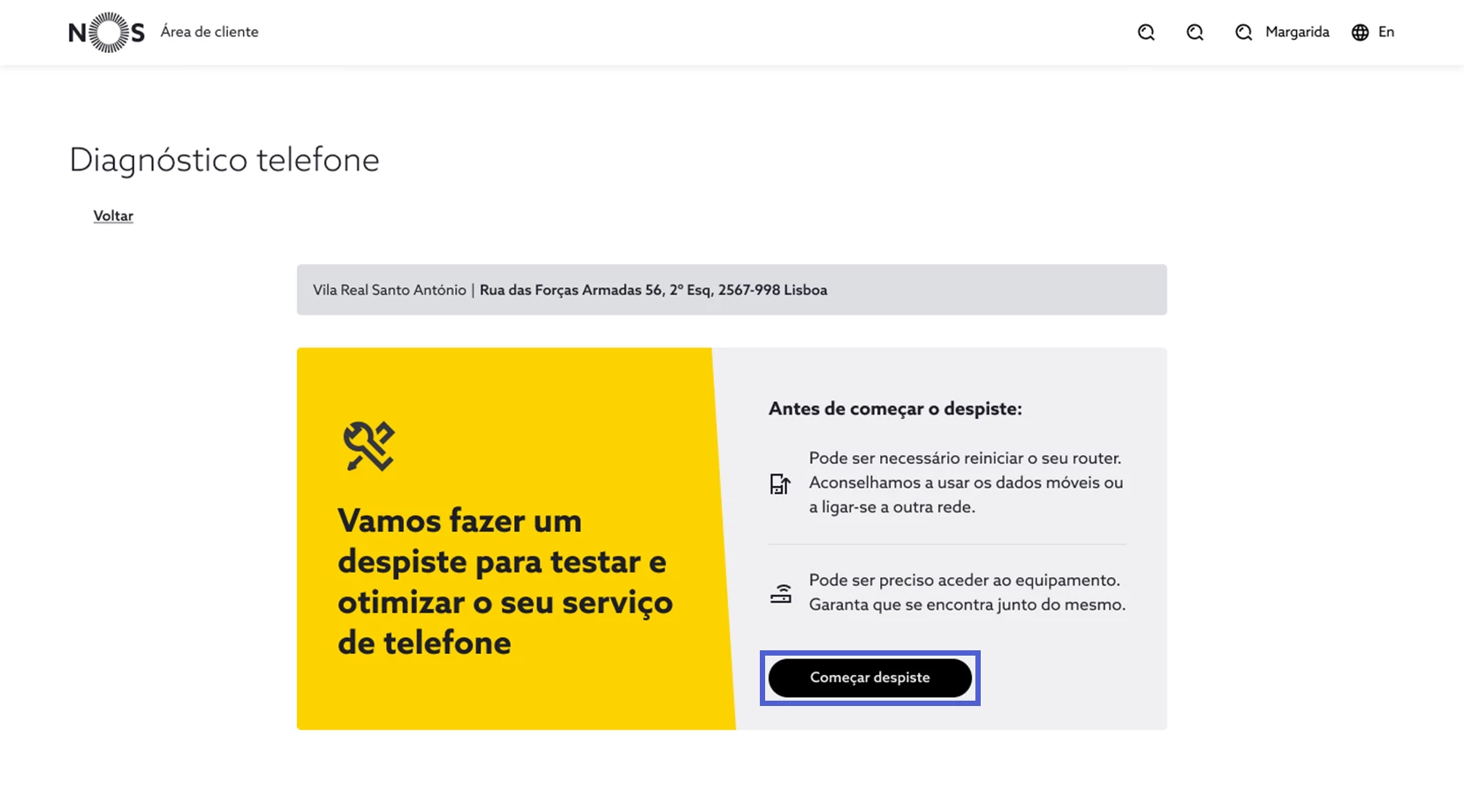 - Se forem identificados problemas, escolha “Iniciar Processo” e avance com o processo de resolução automático, sendo que pode ser pedido que realize algumas validações junto do telefone fixo.