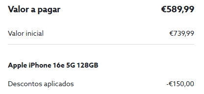 Quero comprar o telemovel iphone 16e usufruindo da campanha Desconto Cliente Nos sem entrada e verifico que nao consigo desde o inico da campanha fazer a compra pois na finalizaçao da compra online nao corresponde ao valor que é dito na campanha!