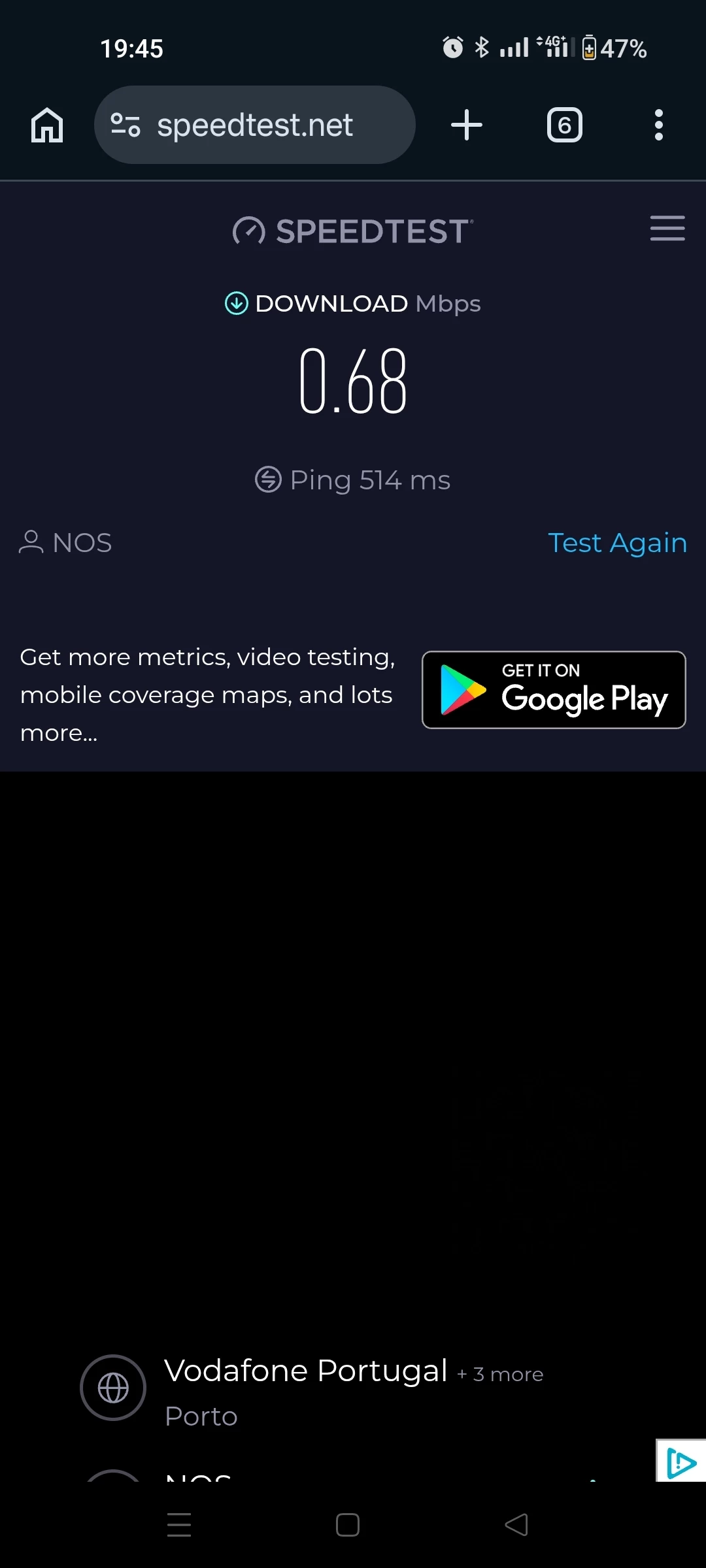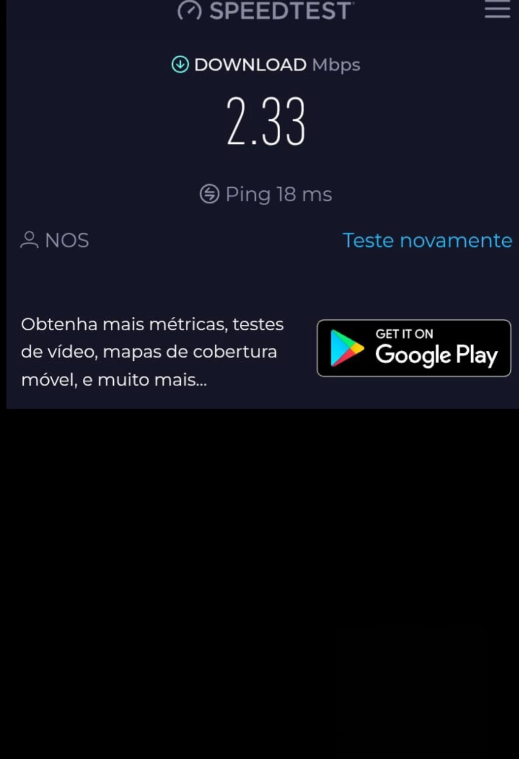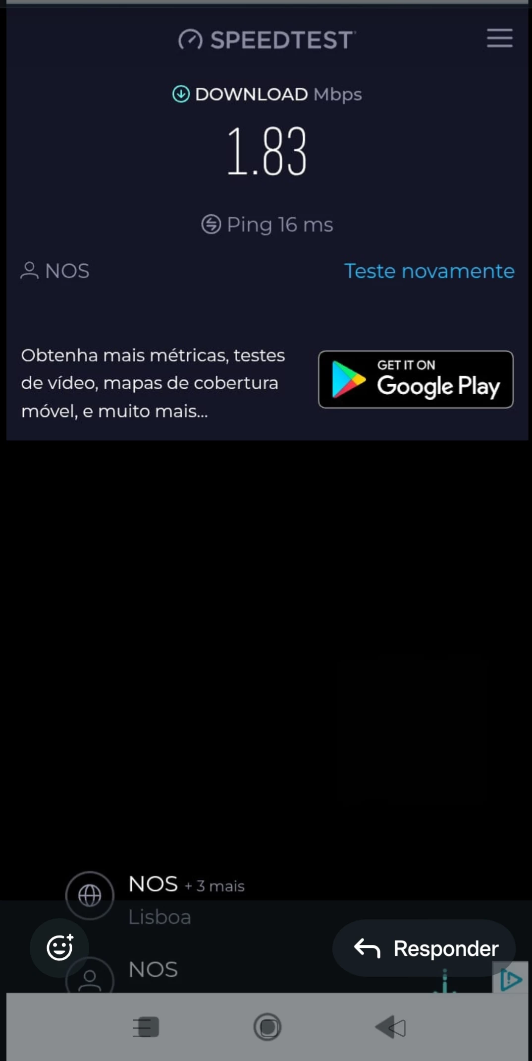 Acabei de fazer um teste de velocidade e é ridículo não ter sinal. Um dos motivos que me levou a mudar para a NOS foi a boa cobertura de rede, e contratei um serviço com mais velocidade e GB, para ter essa liberdade, o que se momento não acontece.