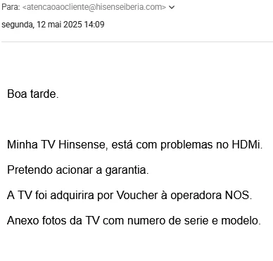 Segundo a Loja aqui na Horta não ficam com a TV para reparação. Disseram me que contactasse a Hisense.
