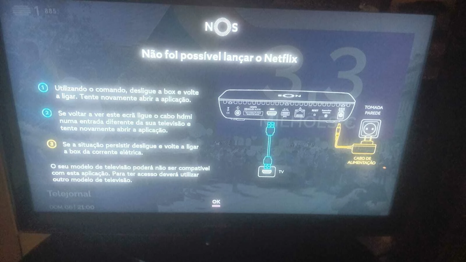 Há 3 anos que contratei o serviço IMA da Nos que incluia Netflix. Porém, nos últimos meses perdemos o acesso e recebemos esta mensagem. Já desliguei várias vezes, já troquei a porta HDMI e já desliguei e voltei a ligar todos os cabos. A mensagem é sempre a mesma. O problema não pode ser a televisão pois uma box alternativa a NetFlix funciona. Será que alguém me consegue ajudar? Obrigado.